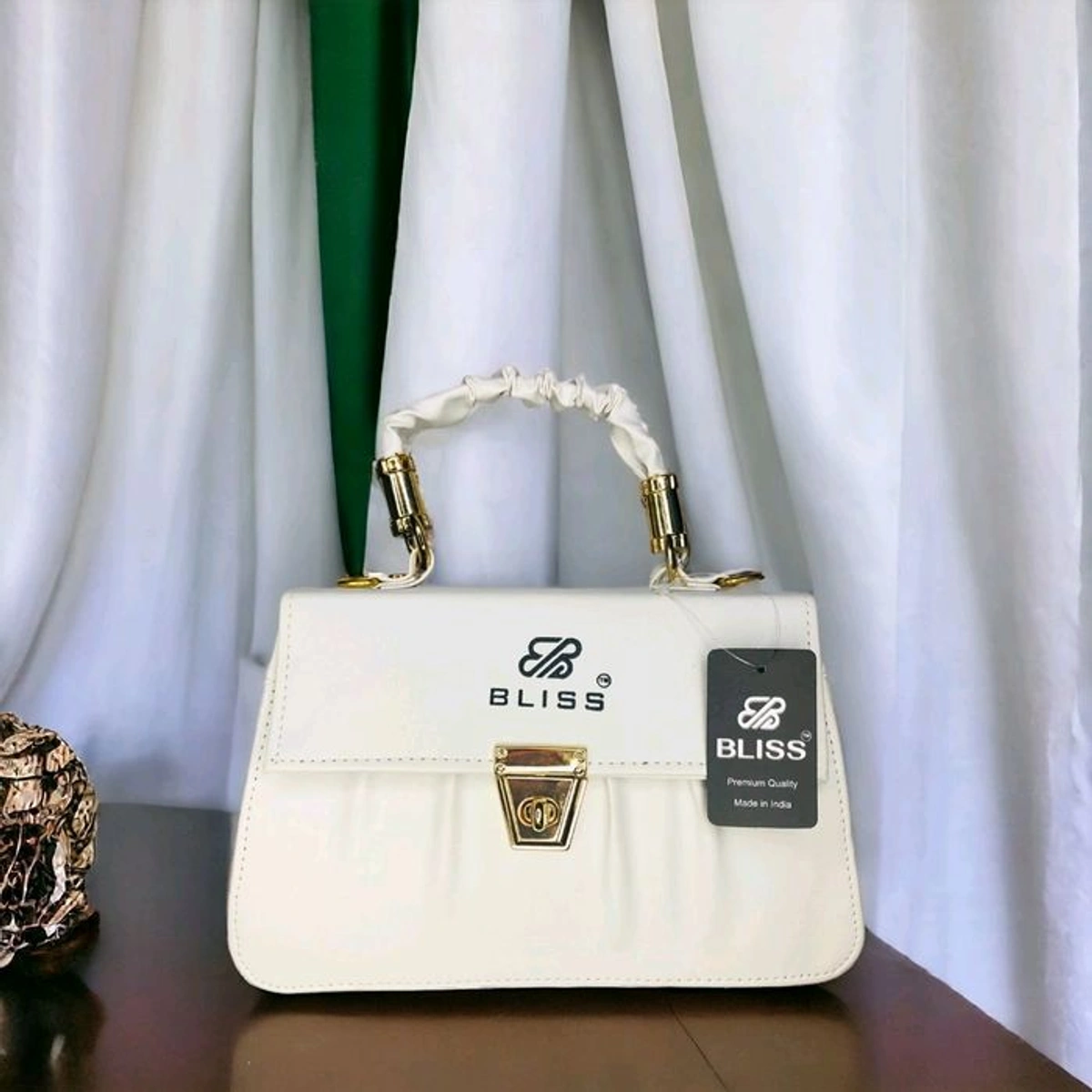 Add a touch of sophistication to your outfit with this stunning white handbag from BLISS. Designed with premium materials, it features a chic ruched handle with gold-tone accents and a secure front clasp. Perfect for formal events or everyday elegance, this Made-in-India masterpiece is a must-have for fashion lovers