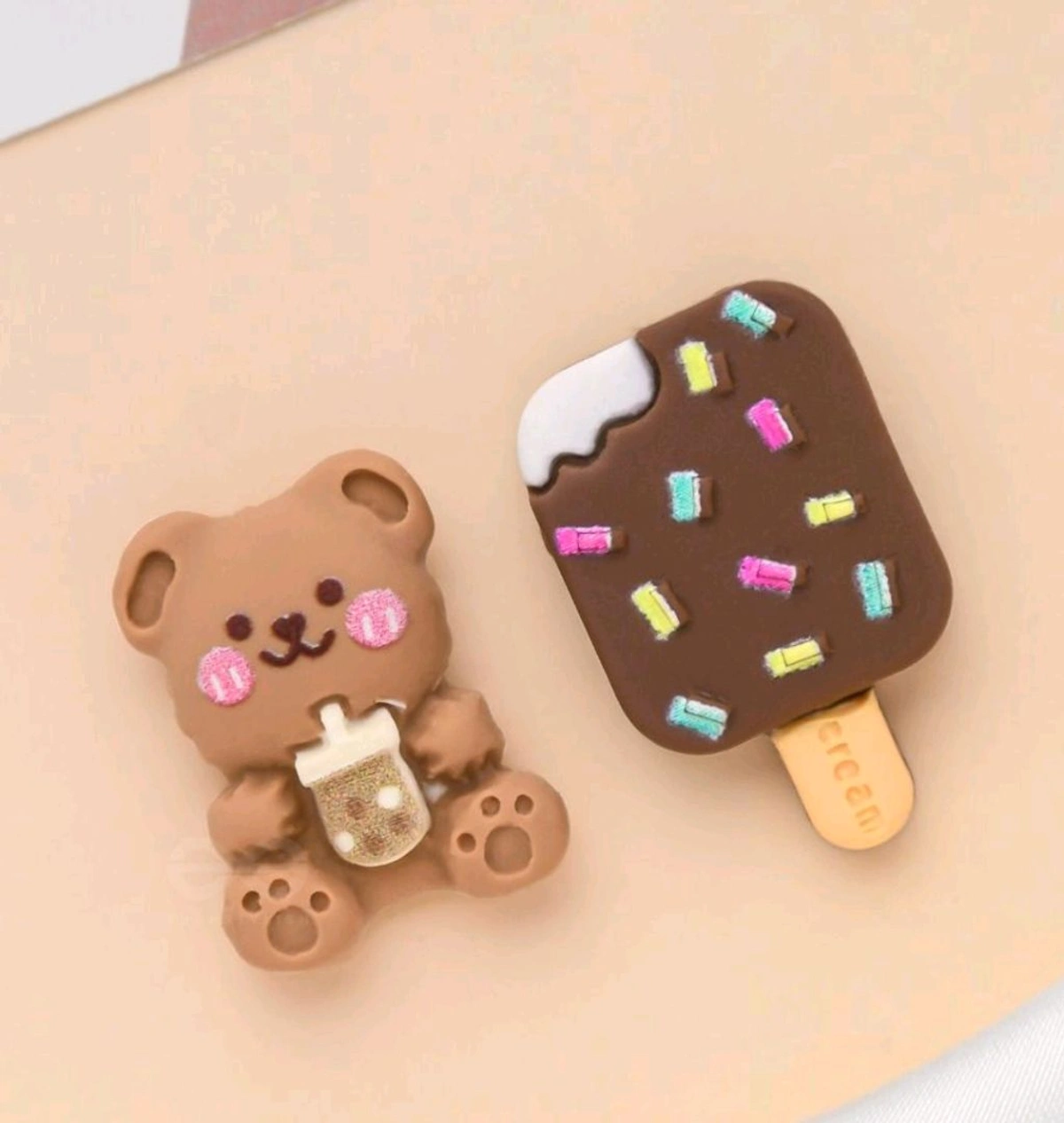 A playful pair of mismatched earrings featuring an adorable teddy bear sipping bubble tea and a colorful chocolate popsicle with sprinkles. Made of soft resin, these whimsical accessories are perfect for adding a fun, youthful vibe to any casual look.