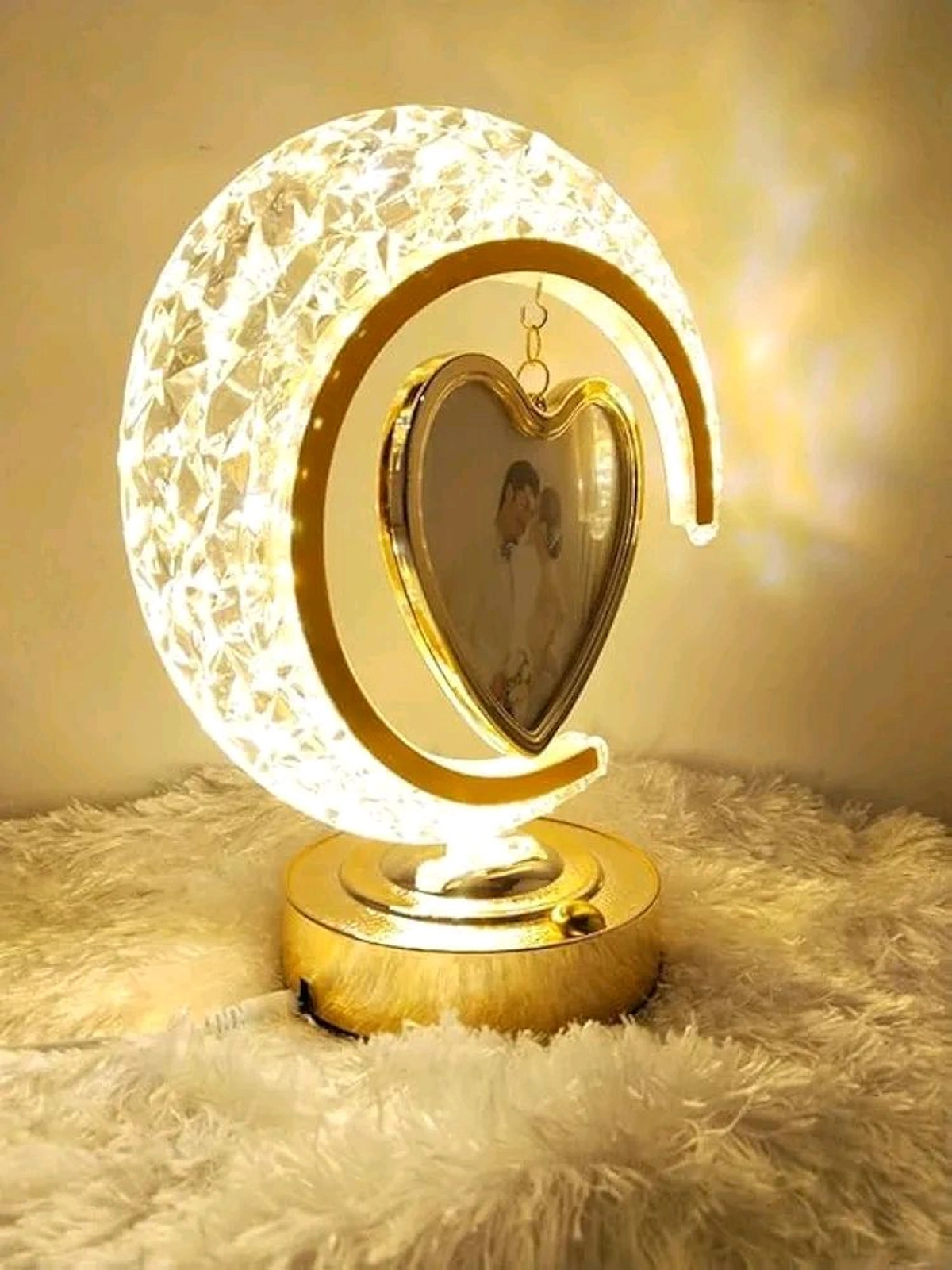 Illuminate your cherished memories with this elegant crescent moon LED photo frame. The dazzling crystal-textured design emits a soft, romantic glow, perfectly framing a suspended picture of your loved ones. Ideal for weddings, anniversaries, or as a heartfelt gift, this decorative piece adds warmth and charm to any space. Let your memories shine as beautifully as the moonlit night