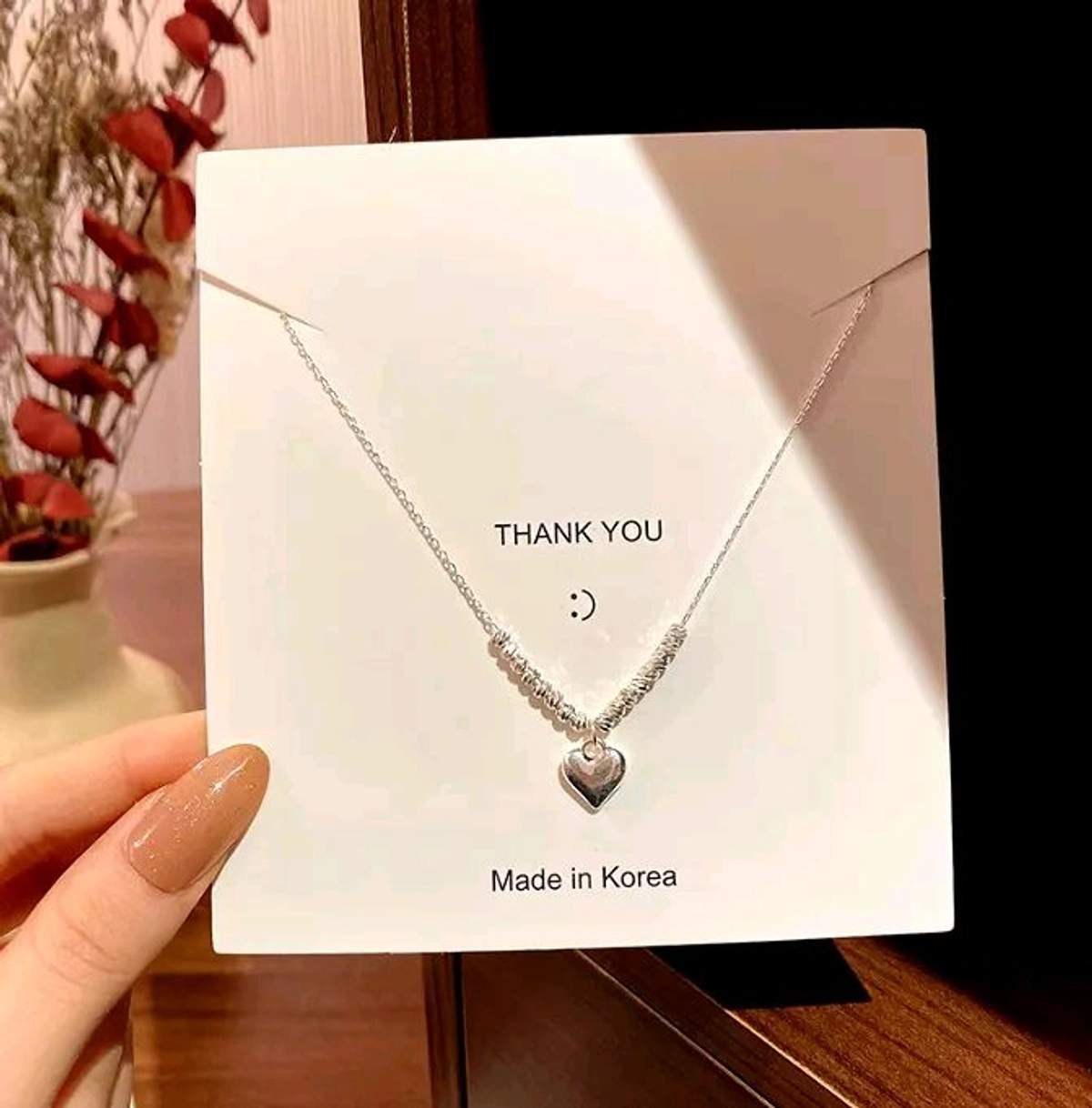 A delicate necklace featuring a shimmering heart-shaped pendant accented by a string of polished beads. This timeless piece exudes charm and grace, making it a perfect accessory for romantic evenings, special occasions, or everyday elegance.