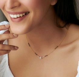 A delicate and modern take on tradition, this minimalist mangalsutra features a sleek chain with elegant black beads and a sparkling centerpiece. Perfect for everyday wear or special occasions, it adds a touch of sophistication to any look.